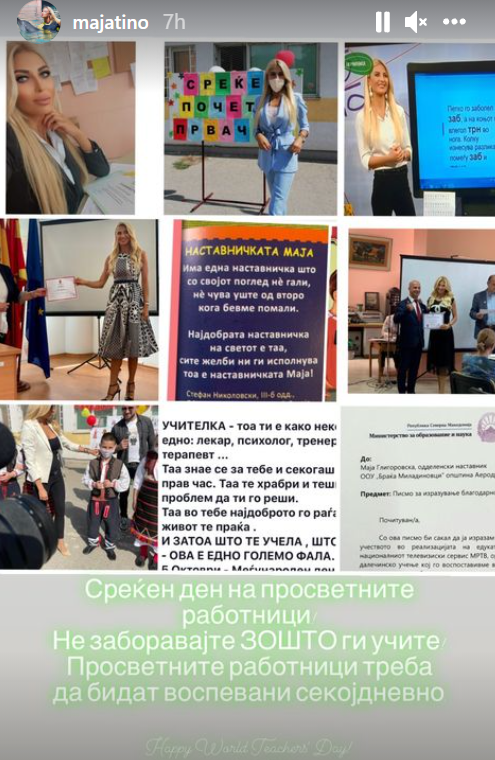 Покрај сликите од учениците кои ги објави, таа упати порака: Среќен ден на просветните работници. Не заборавајте ЗОШТО ги учите. Просветните работници треба да бидат воспевани секојдневно“, порача Маја.