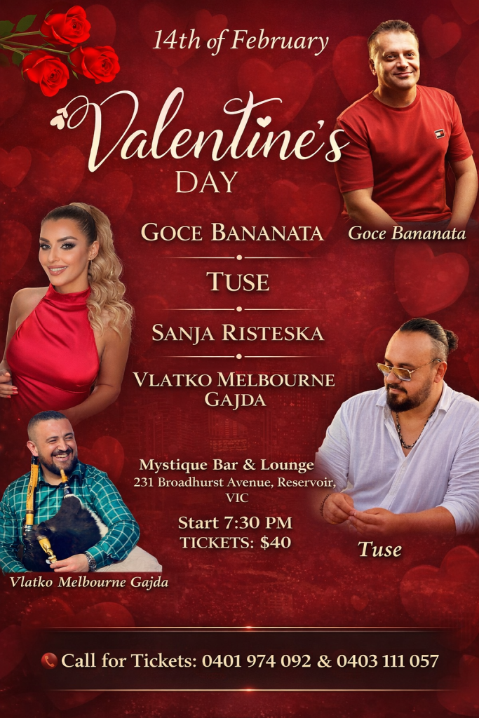 По повод Денот на вљубените – 14 февруари, македонската дијаспора во Мелбурн ја очекува незаборавна музичка вечер исполнета со најголемите хитови од 90-тите години, љубовна атмосфера и автентичен македонски звук.